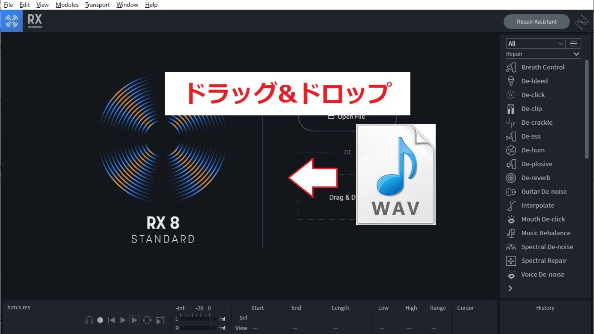 まずはRXを起動して、用意したカラオケ音源をドラッグ&ドロップで読み込ませます。