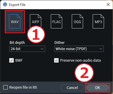 - ①ファイル形式は『WAV』を選択