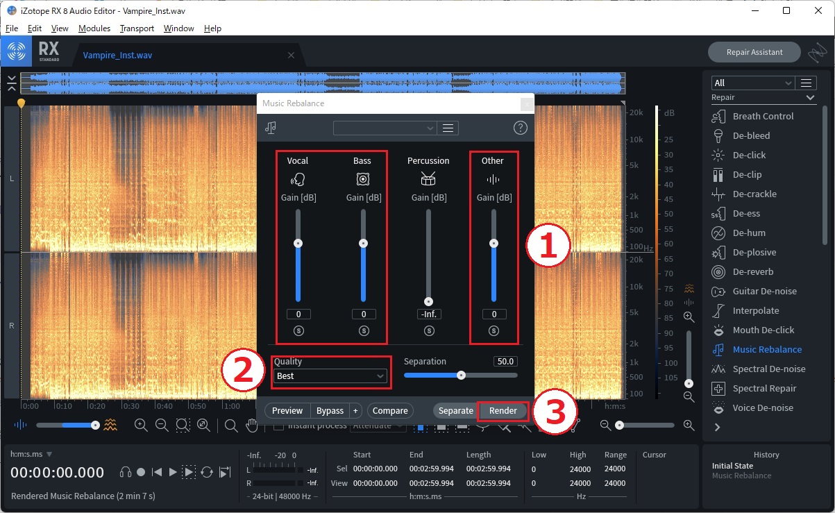 なぜこのような良い音質になるのかと言うと、先程のAudacityと違いRXでは"リズムトラック"と"それ以外の楽器"に分離して、リズムトラックには何も影響を与えない(キー変更をさせない)でいるからです。