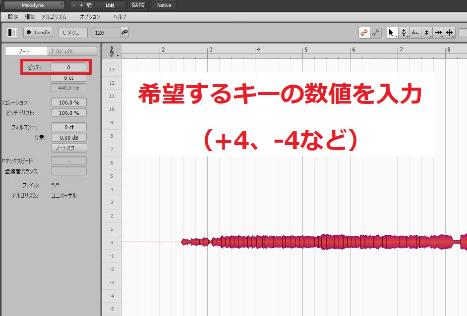 ピッチの欄に好きな数値を入れれば、希望するキーに一瞬で変更されます。